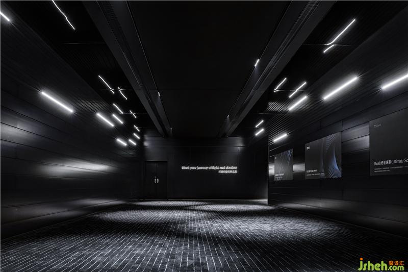 Into the main hallway, lights installed on both sides of the walls are like meteors. The ceiling made from black mirrors expands the space with the reflection, which appears to be a futuristic time tunnel in the dark background. The strong directional lines on the floor extend to the end, providing the viewers with a visually dynamic experience while guiding them along the way.
