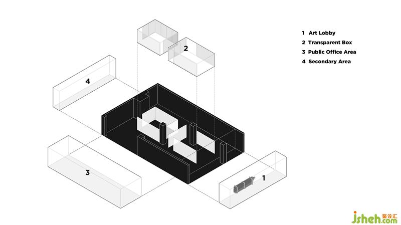 我们在空间中央置入两个透明盒子,以此将空间划分为四个区域:艺术前厅、透明盒子区域、公共办公区与辅助区域。