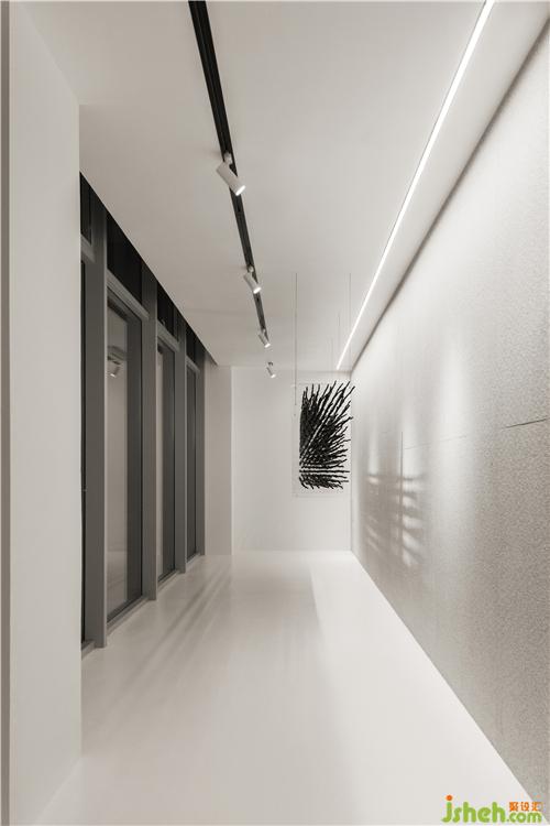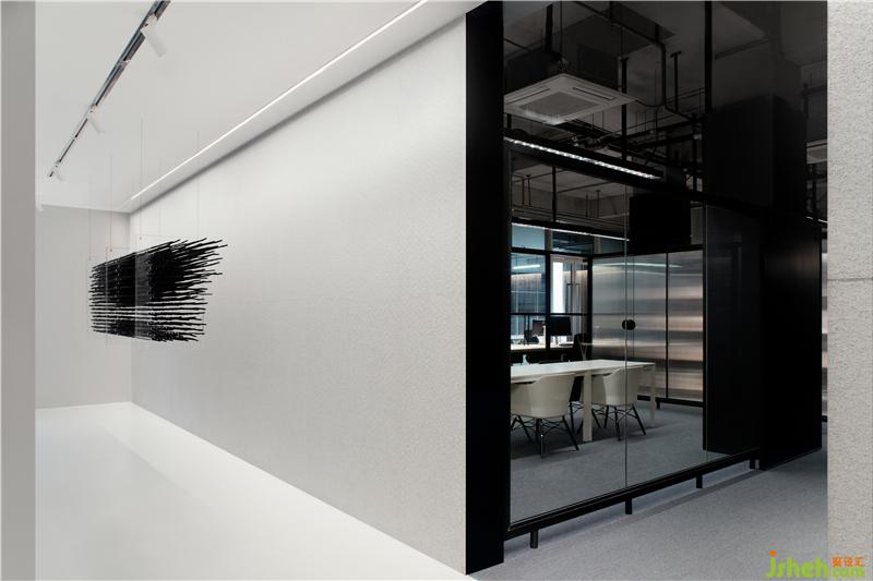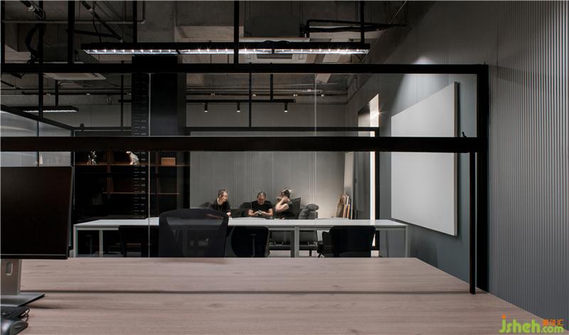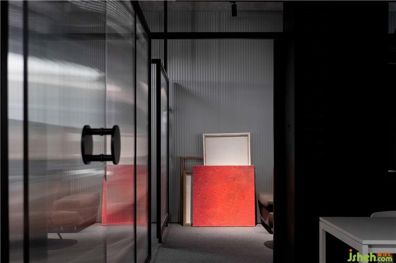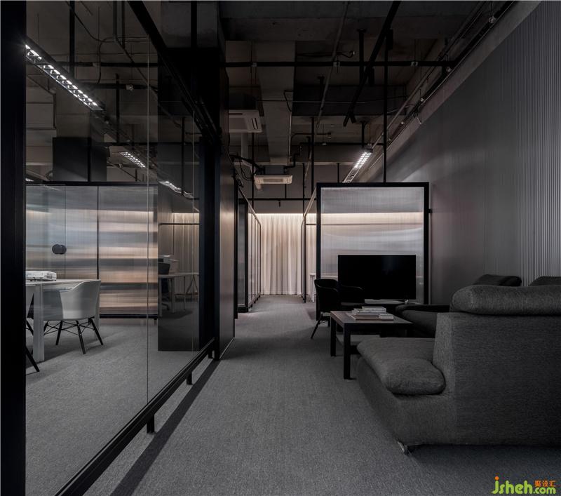 通过前厅进入室内办公区,空间的基调由亮转暗,自然的完成了空间氛围与情绪的转换。