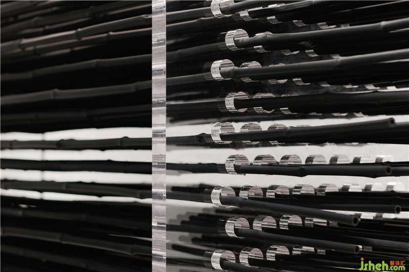面向中央走廊的区域被划分为艺术前厅,在纯净的灰白色麻石墙面的衬托下,黑色竹子构成的立体书法笔触艺术装置,深圳办公室设计在为社区住户提供有趣的展示面的同时,也有效的划分了空间,将需要专注的办公区域隐于其后。