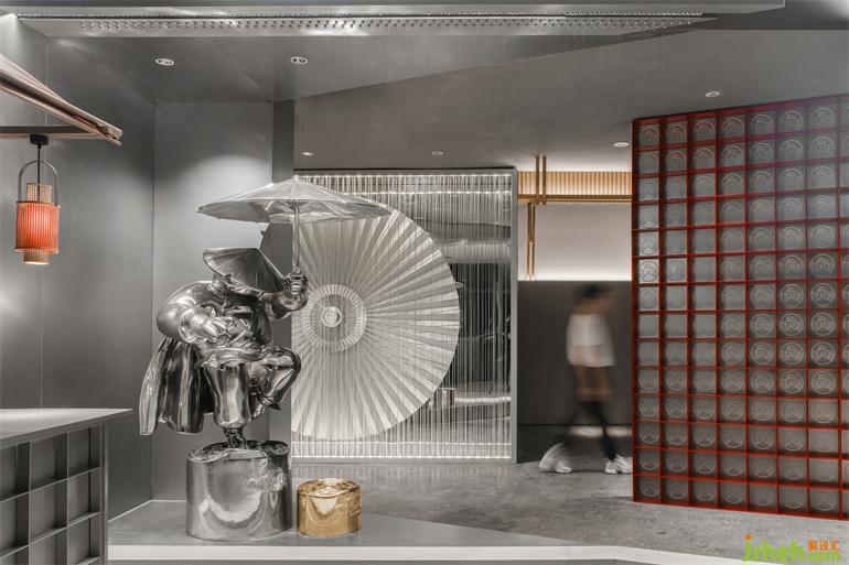 蛙小侠的IP形象也进行了一次深度定制,整体镀铬镜面的效果更具现代感,手中撑伞并轻盈落于水面的姿态,南宁餐厅设计更加深了雨景和侠客之间的关联印象。