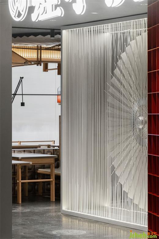 在入口处设置的动态雨伞装置,通过伞面装置和伞架装置双层反向旋转的形式,南宁餐厅设计形成空间的视觉焦点,同时在入口处也隐约可见该装置,给人以探究的欲望。