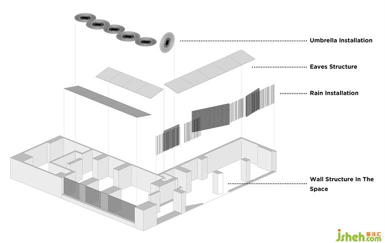 入口处可看到旋转的雨伞装置,前方通过钢丝和灯光形成“雨丝”