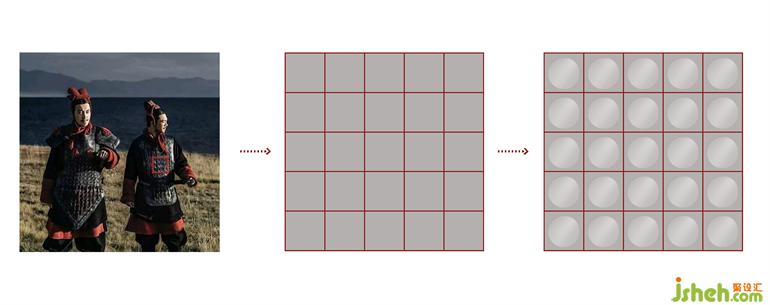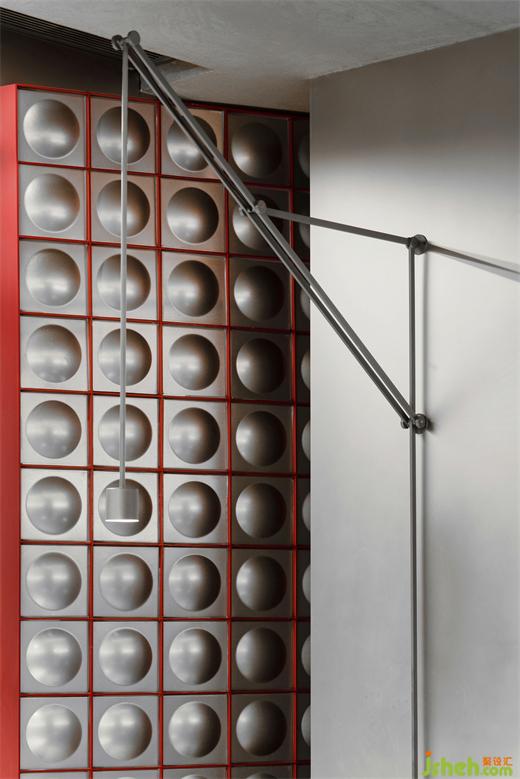 空间的隔断使用大面积的不锈钢方块结合品牌色进行设计,每个方块上都有一个圆形的凸起,其设计元素来源于作战时的护具甲胄,回应“守护”精神内核。
