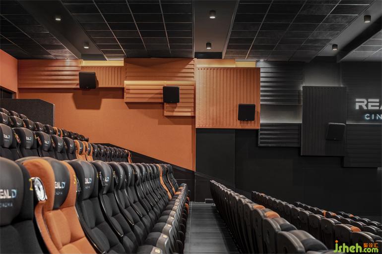 影厅设计结合结构体块与色彩进行设计,影城设计在满足影音效果需求的基础上,在暗色调之上叠加少量亮橙色与结构,让影厅更具动感与沉浸感。