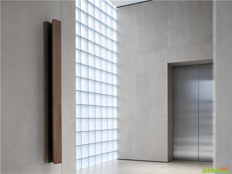 The elevator connects the first to third floors of NIO House, so users have access to different floors. Large glass blocks cast in soft light in the elevator room and illuminate its role of space transition.