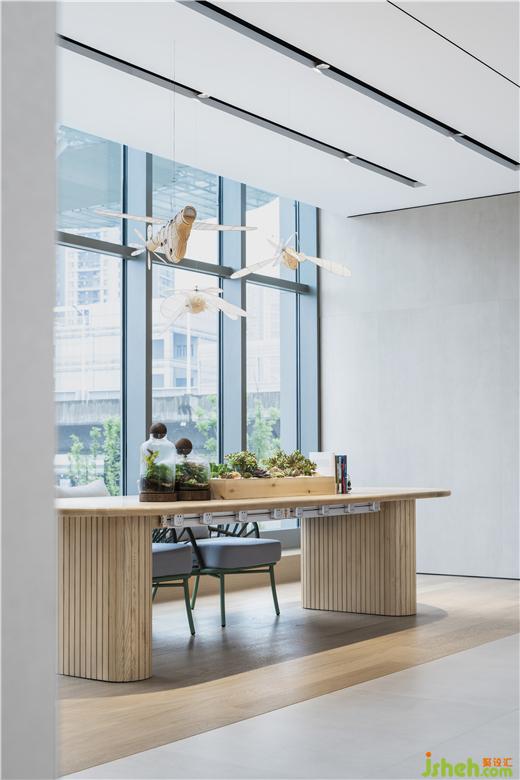 进入二层Club,空间内部大面积使用米白色与原木的搭配,4S店设计通透的落地玻璃为室内带来明亮舒适的自然光照,水岸长廊与城市绿地也进入视野,自然、温暖、舒适包裹着空间中的人们,形成一个友好的共享社区氛围。