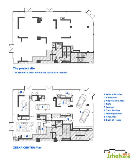 The center show car can also be seen from the showroom. We have planned a VIP room along the load-bearing wall between the two show areas, as well as an open negotiation area on the other side.
