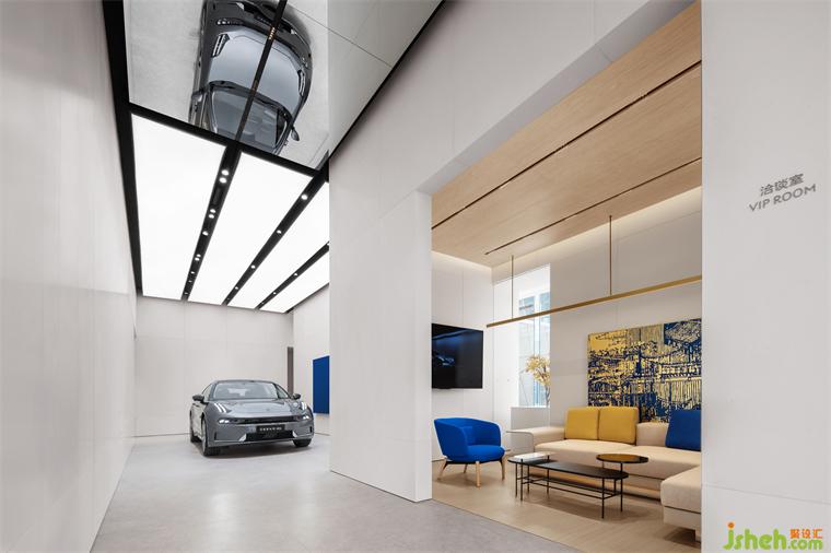 极氪中心西安南湖金座展厅设计从展车区也可以看到空间中部的展车。在两个展车区域之间,我们依承重墙规划了VIP洽谈室,承重墙的外侧一圈则形成了开放式的洽谈区域。