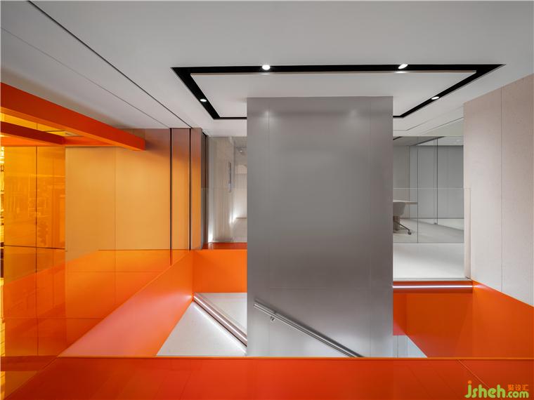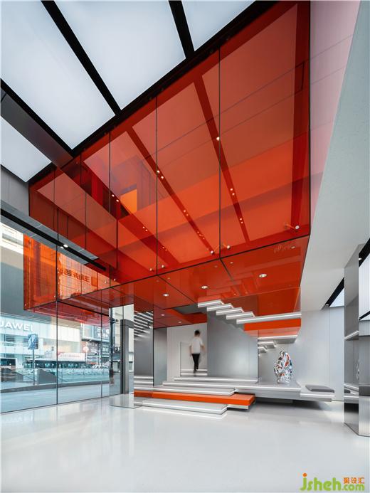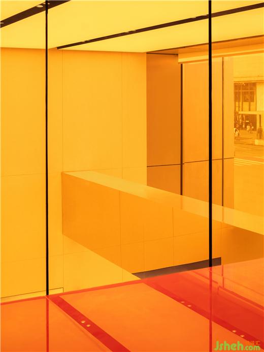 The designers effectively separated the interior space from the busy street through the use of a receding lobby facade and the orange glass box. This approach achieves a delicate balance and precise articulation between the bustling energy of the street and the peaceful silence within, creating a fully immersive environment for users to enjoy.