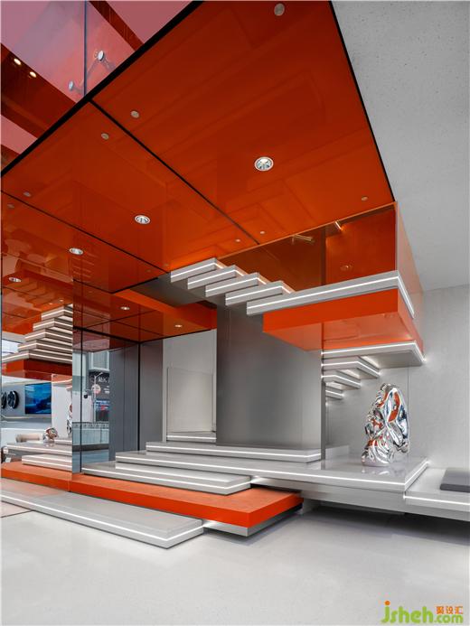 极氪中心展厅设计师通过内退的大厅立面和“悬浮”的橙色玻璃盒子,隔开了川流不息的街道与室内的联系,同时也在展车区与用户区之间置入了一个橙色的过渡空间,实现喧嚣与沉静之间的平衡与衔接,为用户创造了一个沉浸感的场域环境。