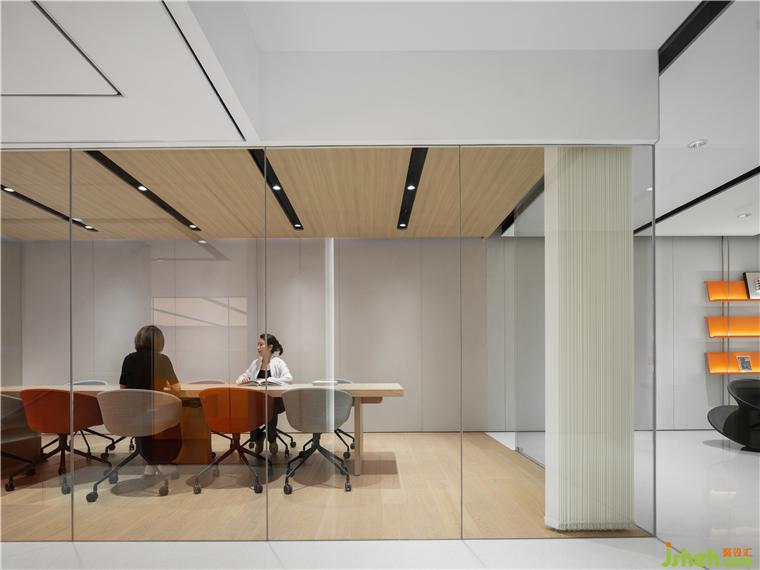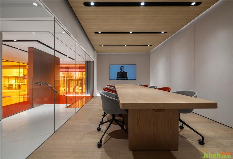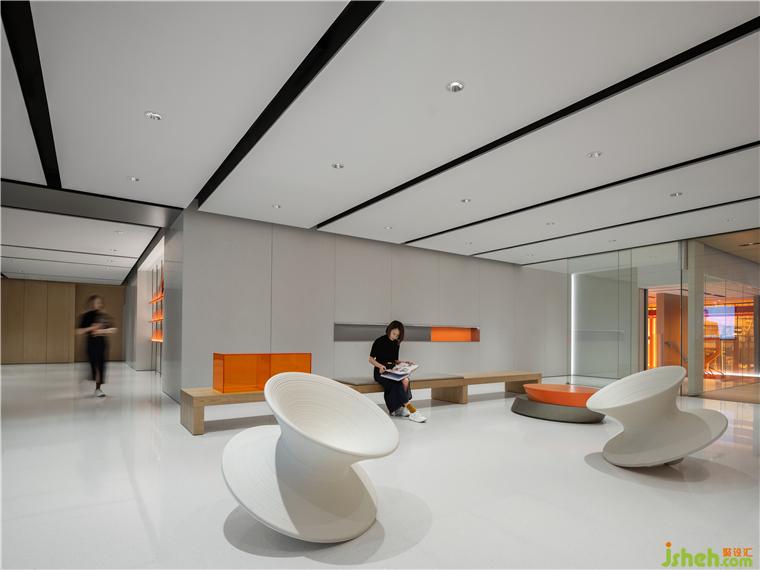 楼梯连通至二层的艺廊区,极氪中心展厅设计通透的展厅为活动和展览提供了空间,包括一个可供社群活动使用的会议室和开敞的展厅——这是一个更加灵活、开放、可变的空间,鼓励人们探索空间与生活互相激活的可能性。