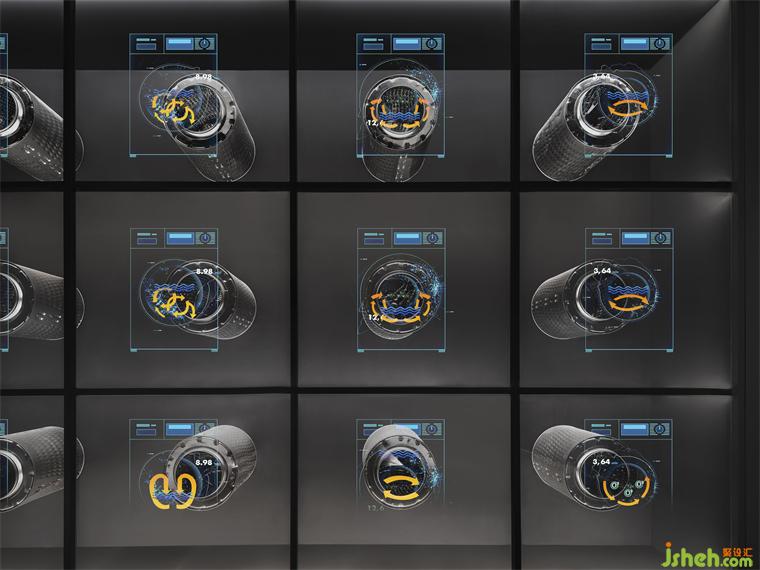 展厅的另一侧规划为洗衣产品技术展示区。体验中心设计师将产品进行解构展示,墙面的互动装置游戏让参观者轻松的了解枯燥的技术细节。