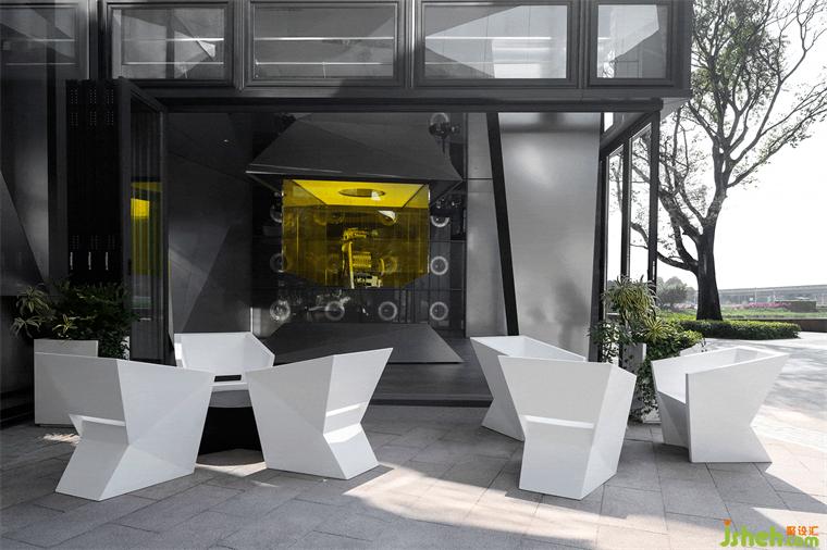 毗邻休闲步道一侧的咖啡区配合可开启的幕墙,体验中心设计将室内的空间向室外进行延展。