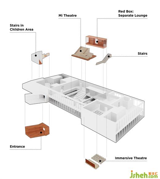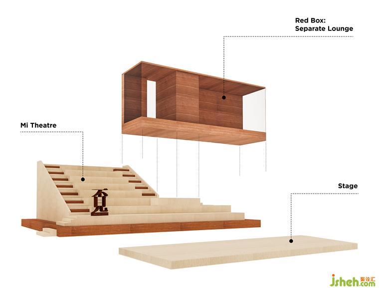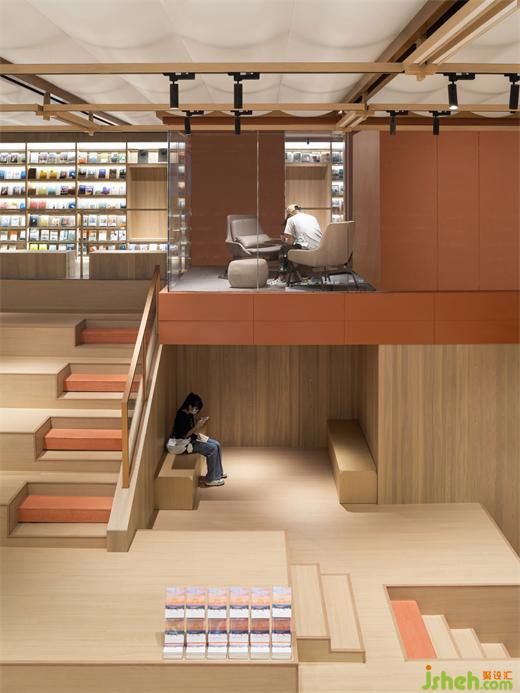 “红色盒子”的下方形成的小空间,则自然的形成了开放式的小型协作讨论区。书店设计围绕着剧场阶梯组织的不同的交流协作区,让交流的方式更加的多样化。