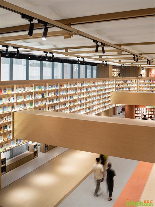 剧场区域通高的空间结构,设计师通过连续的完整的书柜矮墙完成图书氛围的横向延续和衔接,同时视觉纵线上也达成了不间断的效果。前矮后高的书柜格局,也使图书的呈现更具空间感。