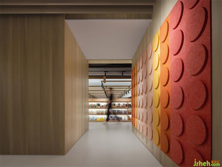 书店设计沿着喇叭盒子的楼梯进入二层的绘本馆,色彩也随之在统一的色调下丰富起来。在色彩的变奏之下,书架放置着分龄的儿童绘本,穿插其中的开放座位让家长与孩子在其中共渡美好的亲子阅读时光。