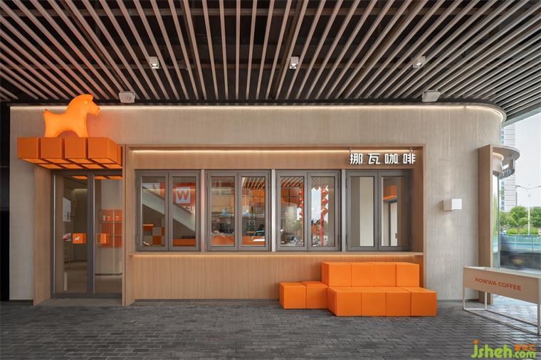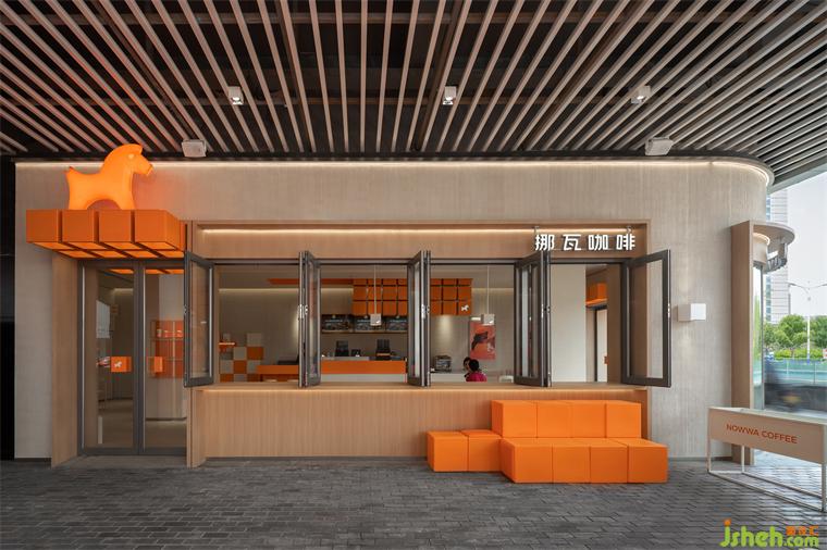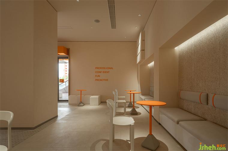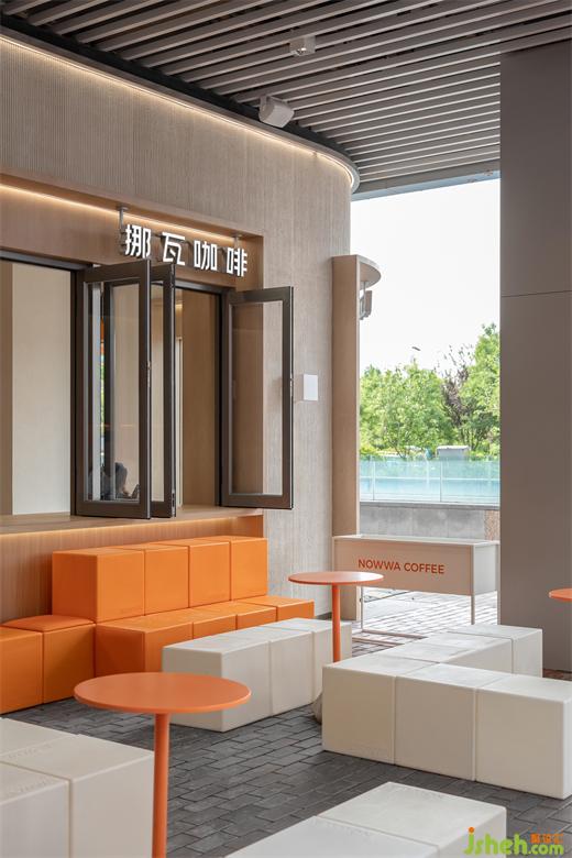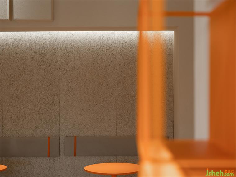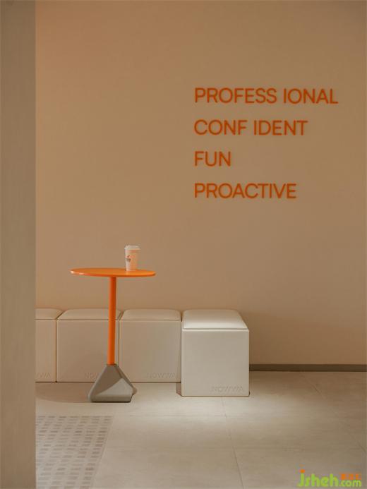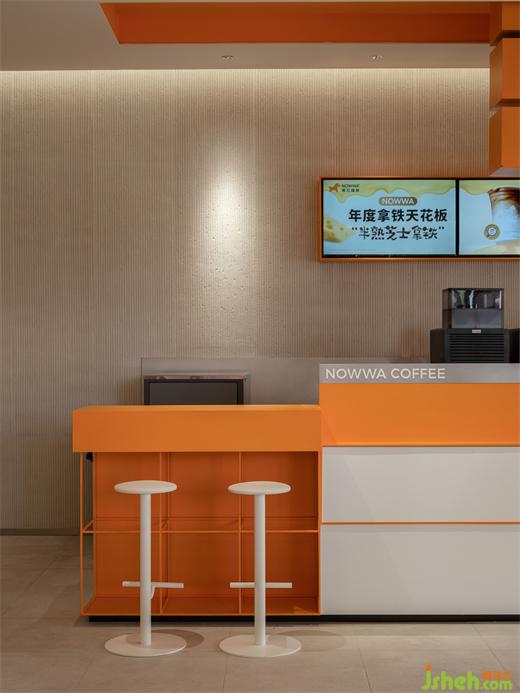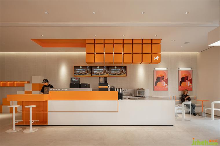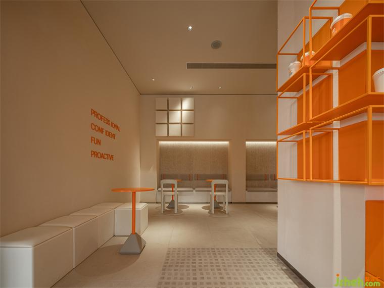 橙色的cube纵向叠起,成为吧台区域重要的识别元素。空间系统设计延长的吧台高凳区,则以cube框架的形式与吊楣的体块形成呼应。橙色和白色的组合明亮活泼,简约的线条不失严谨,这一组合后续将作为办公大堂店的模板使用。