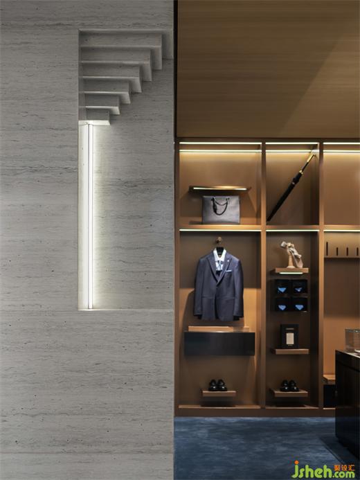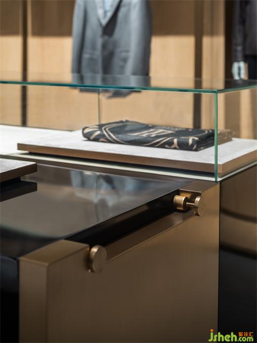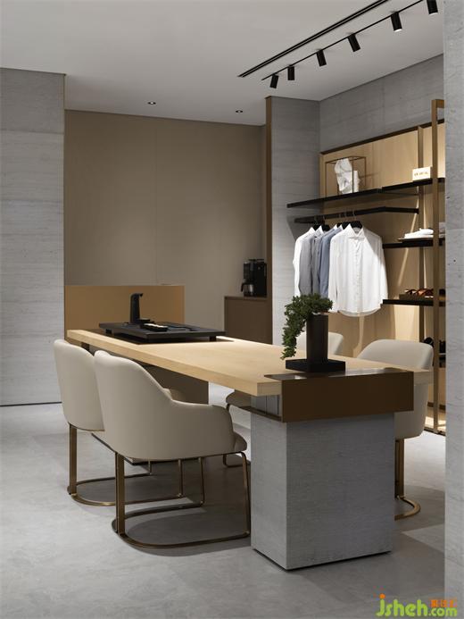 这个区域内,设计师追溯定制的概念,以皮尺的刻度为元素打造精品定制墙,呈现精致严谨的精英气质。