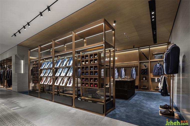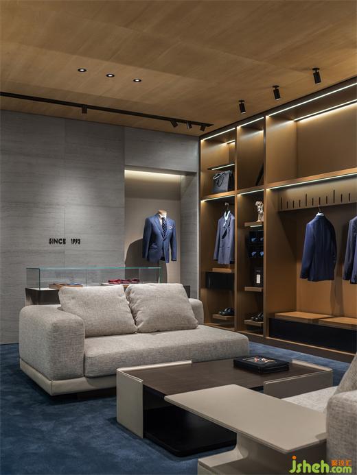 专卖店设计高定区通过深蓝色的地毯沉淀出沉稳的调性,经典的家具与木质的天花共同构建出高雅的氛围。