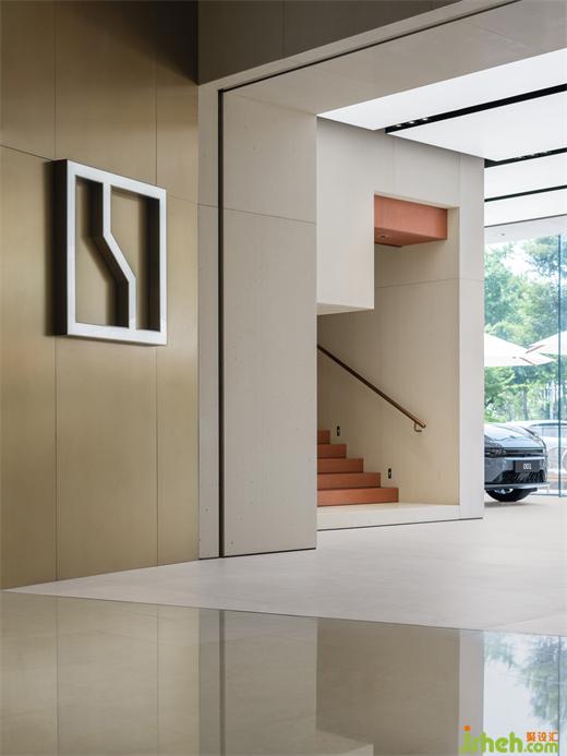 通透的玻璃幕墙引入自然光,米色的石材结合均匀的照明,为展车打造了温暖明亮的环境。橙色的石材点缀其中增加空间活力。