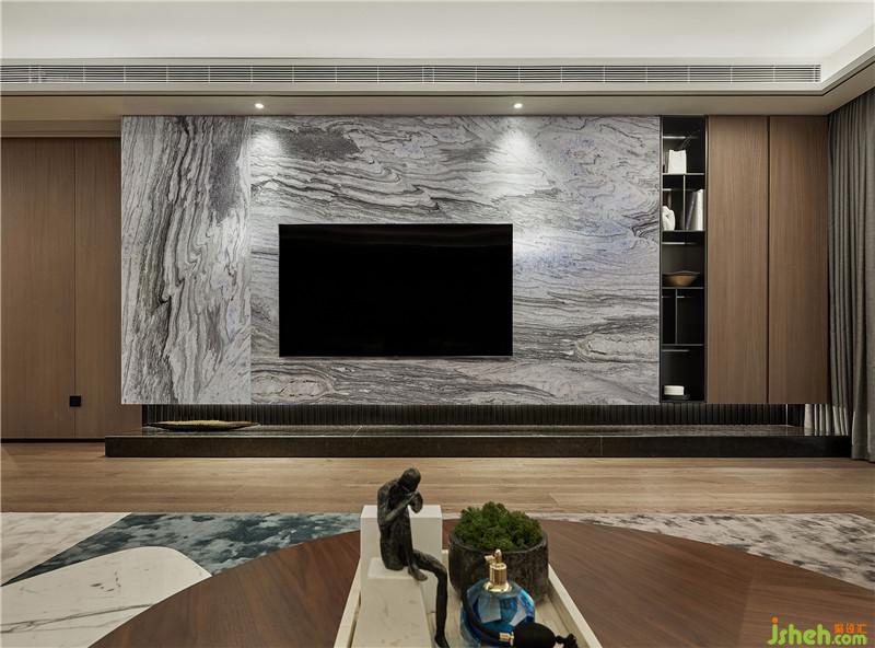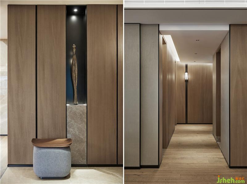 主要用材:石材、黑钢、拉丝黄铜、木饰面、木纹铝方通等