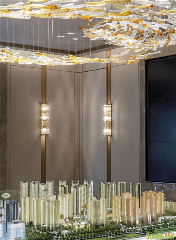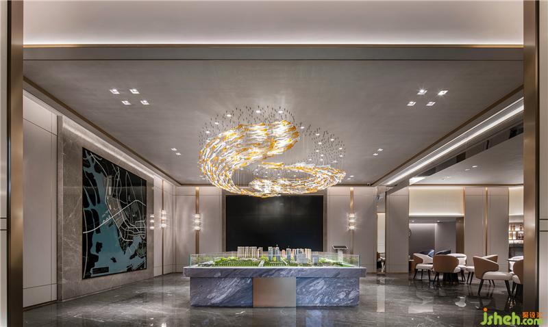 沙盘上空的流动型灯饰,宛若星河于天际又似水流于江海,饱含空间中的人们对城市未来的无限向往。