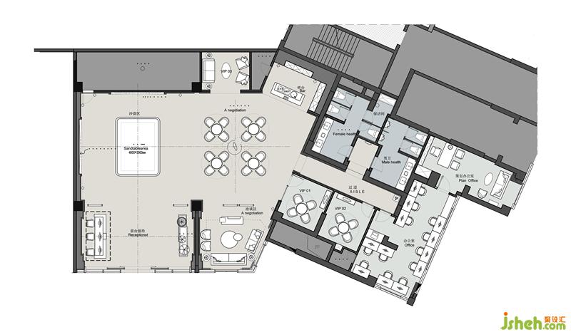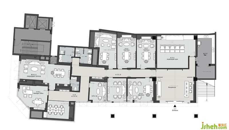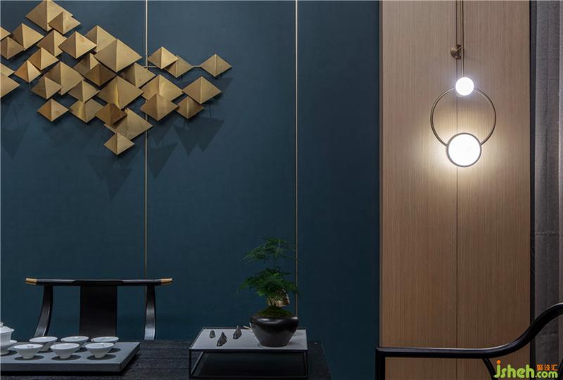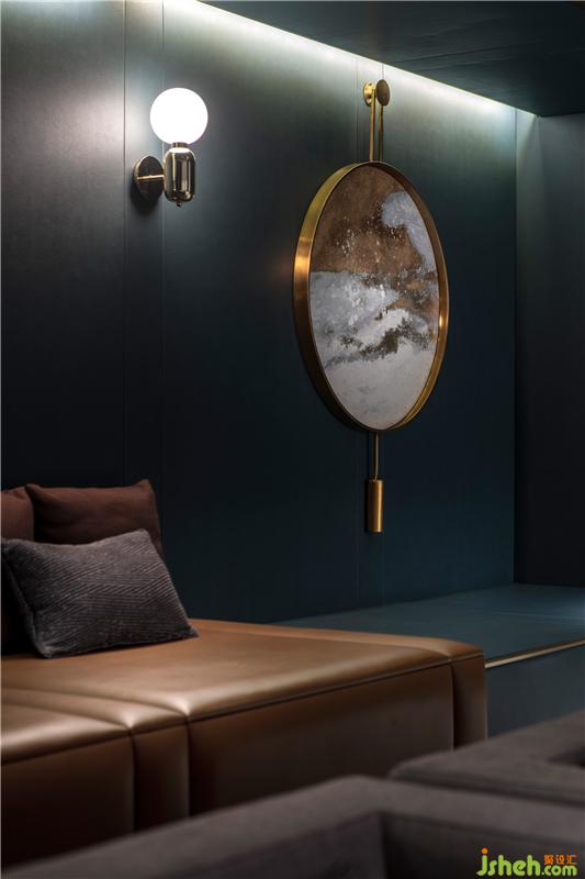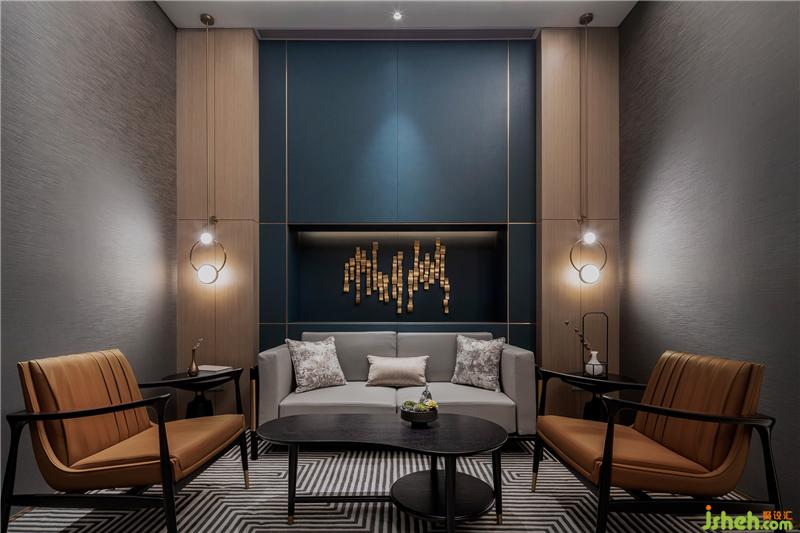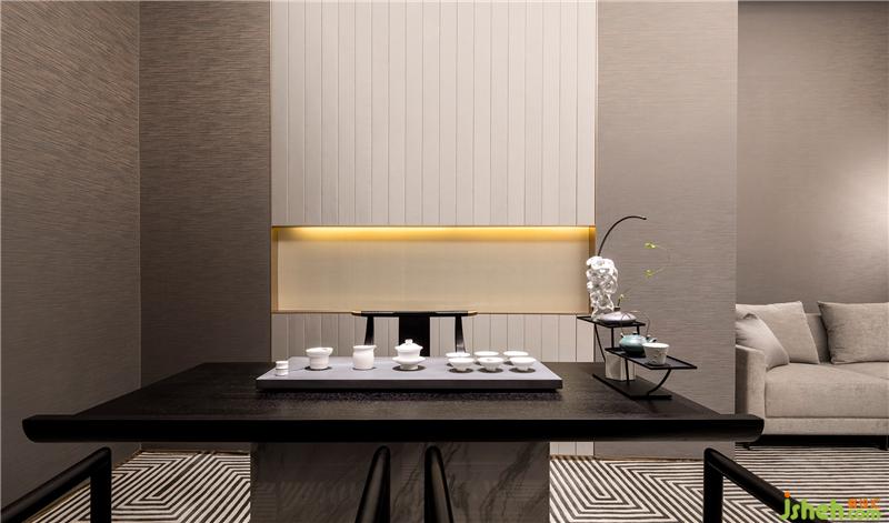 项目分为A区和B区,针对于独立空间的功能性划分,我们在两个区域进行了层次的递进,将展示区置于B区,同时B区也具备初步接待、深度洽谈成交等功能;而A区则以深度洽谈及娱乐体验为主,设置茶室、多功能影音厅,打破常规销售中心固有模式 ,将茶室、影音厅与董事长办公室置于同一分区,一方面方便商业客户的接待,另一方面在深度洽谈的阶段便于一对一细致服务、办理手续等,营造尊贵感。开放区域与独立区域风格区分又相互契合,空间闭合之间模式自由切换,正是这种打破常规的设计语言为空间带来多重功能体验。