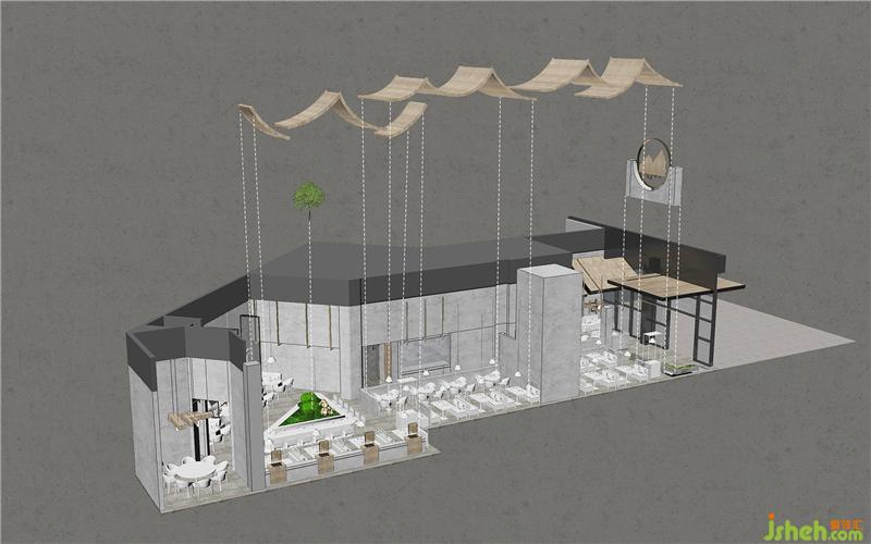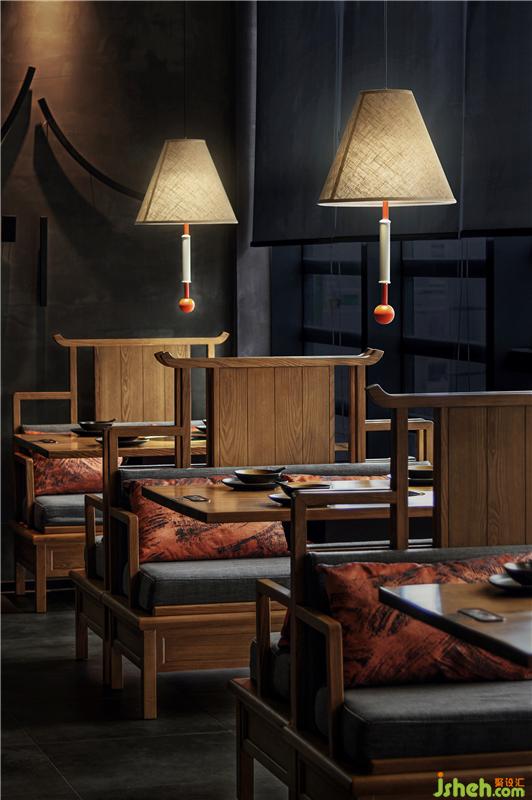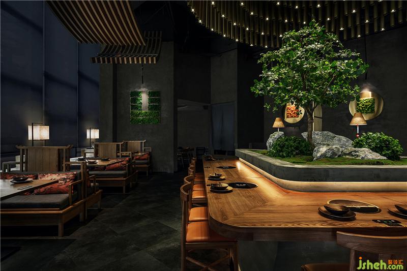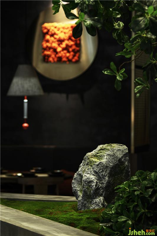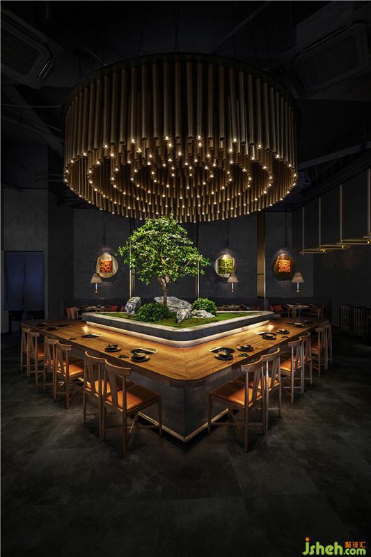 心灵的归属感幻化为具象的屋顶,因为“顶”是设计者心中空间的界定。门口的屋顶元素成为室内外空间的分割,同样的造型元素延伸至室内逐渐深入的归属感在设计者的心中荡漾,我们开始添加一点润物之水,再由水的画面感带来远山在侧清风入怀的遐想。以设计的语言进行时间与空间的交流,达到意与形的和谐,寻找商业空间与东方静学的艺术平衡。理极幽玄以物抵心,造物之美无外本真。餐厅设计