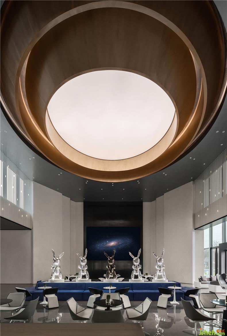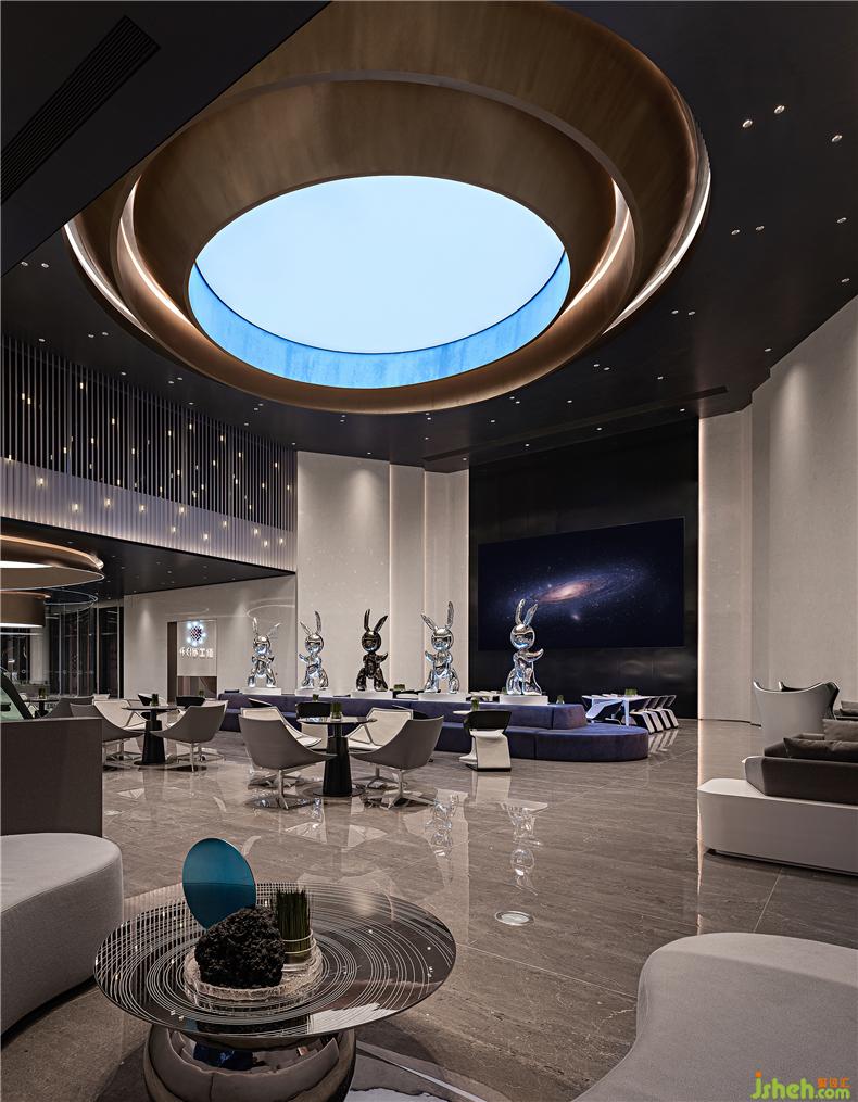 以点绘圆、思想延伸,是这个项目在理念和故事上的共性,基于手游、电竞蔚蓝科技的想象,室内团队以星为象的宇宙空间概念引发建筑园林景观设计的连续性思维,在未来科技主题中还原一个和谐共生的宇宙家园成为这片领域的共同梦想,室内展示空间是这片未来家园的缩影。