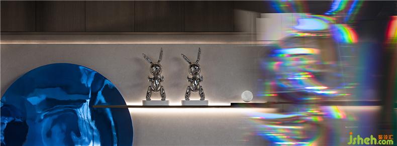 科技感的兔子公仔与墙面月亮装饰交替呼应在空间中,仿佛来自2046的机器人用另一个星球的语言再现童年时嫦娥奔月的传说。