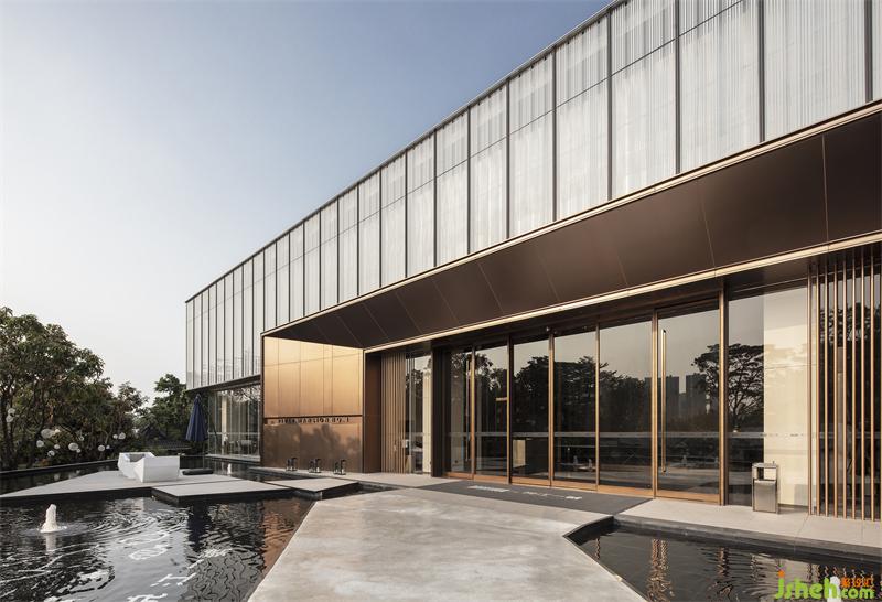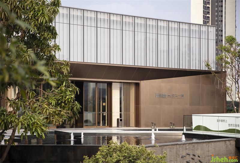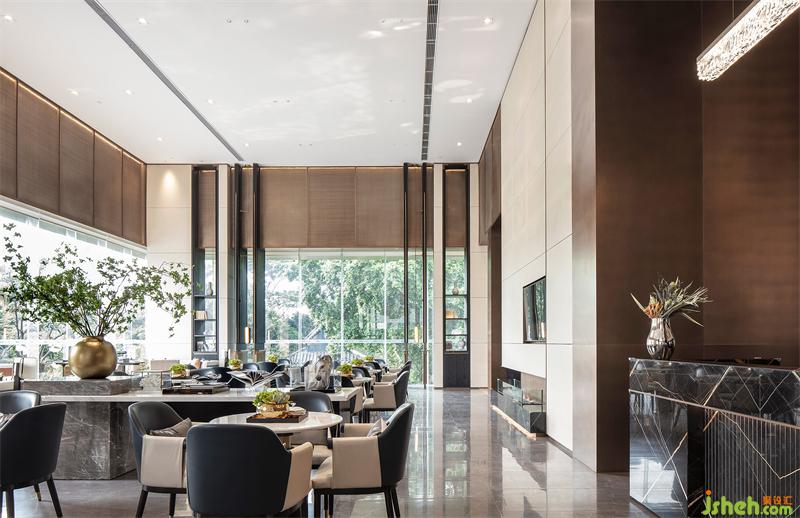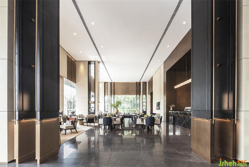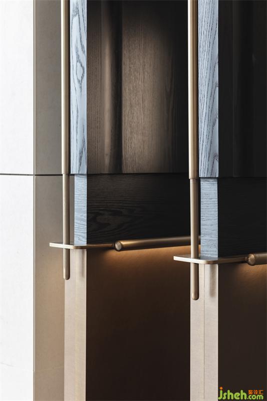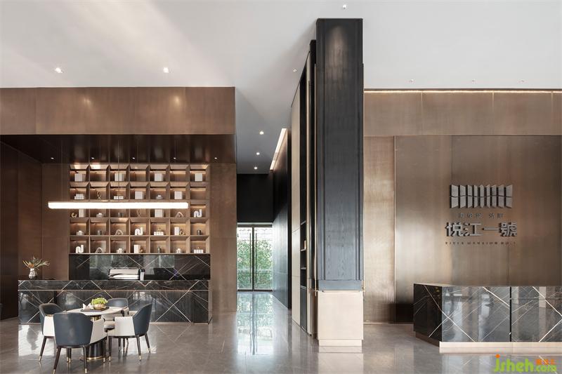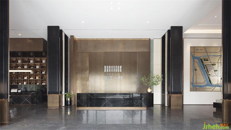 考虑到项目本身的城市以及时代特色,延续建筑简练明快的硬性构成,运用天然石材、不锈钢、木饰面、冲孔板等现代而不失厚重的材质,打造兼具时尚感、力量感的硬朗设计主体,加入古铜金属元素作为材质的文化植入,并将项目江水悦居寓意的logo图形在空间中隐序延展,整体营造出一个拥有文化传承而不失时尚、尊贵的现代都市主体空间。