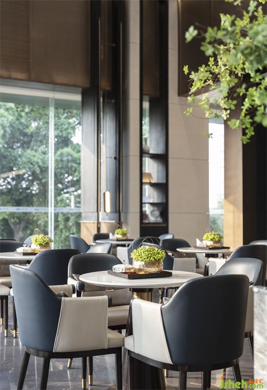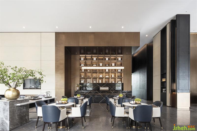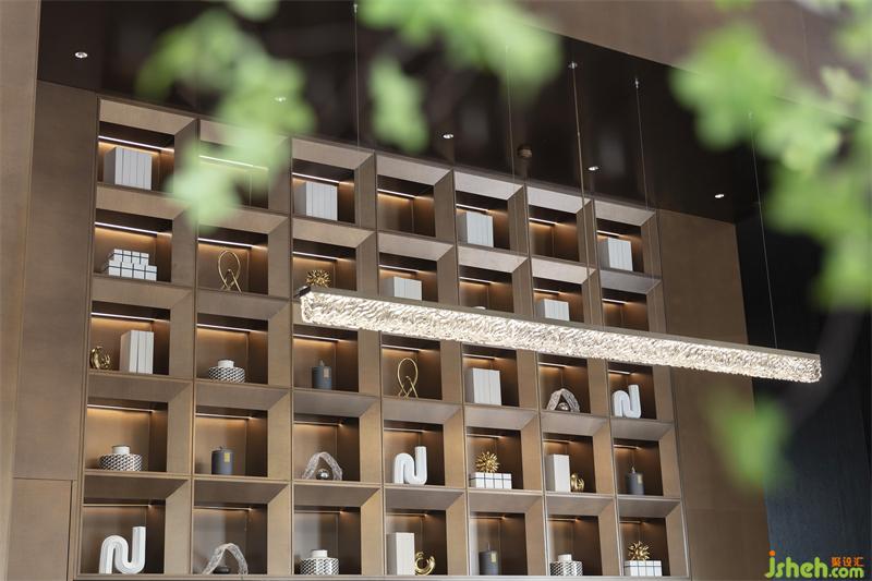 吧台背后的陈列柜,兼具摆放与陈设功能,水波纹的灯饰与水晶摆件主次有序,即使是在看似不起眼的角落,也有江水潺潺的空间景象。