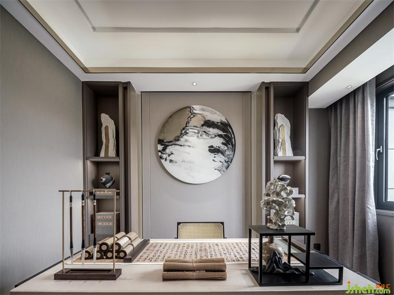 书房的设计,整体空间从结构上呈现出新中式独特的对称美,给人以庄重大气、有条不紊的视觉享受。