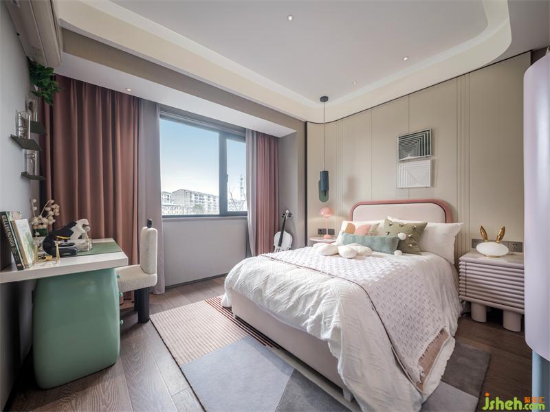 儿童房以简单纯粹的粉色作为主色,象征孩子澄澈的世界。床背的边角做了圆滑处理,床上用品皆采用丝缎般轻柔的面料,给孩子最贴心的呵护,在不经意间将温柔缓缓凝聚。