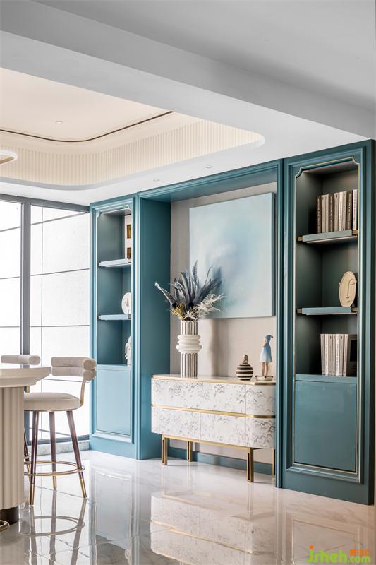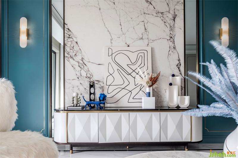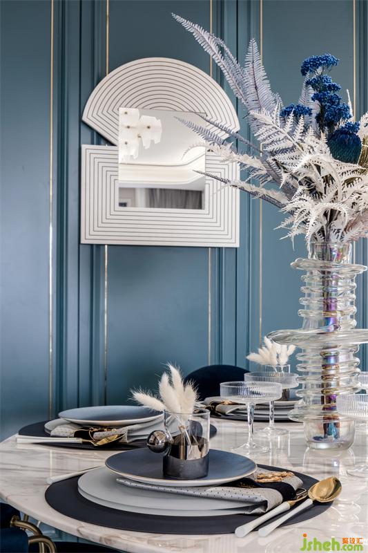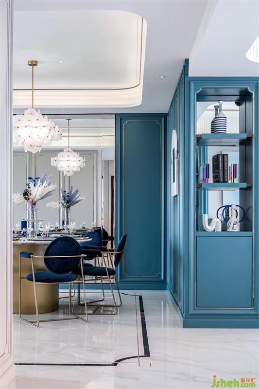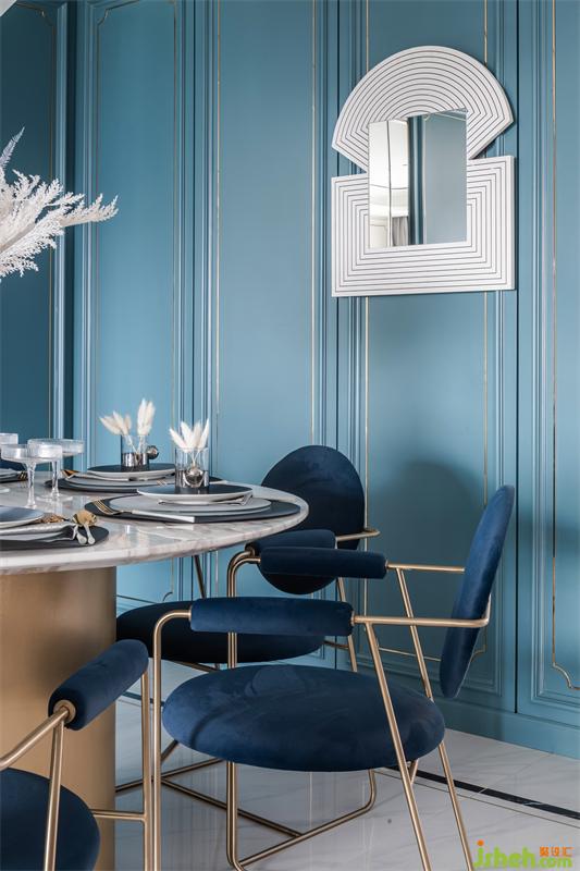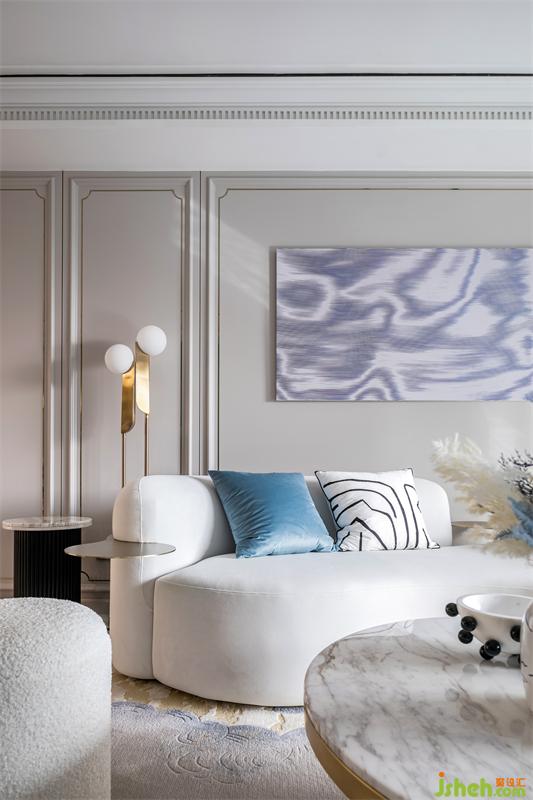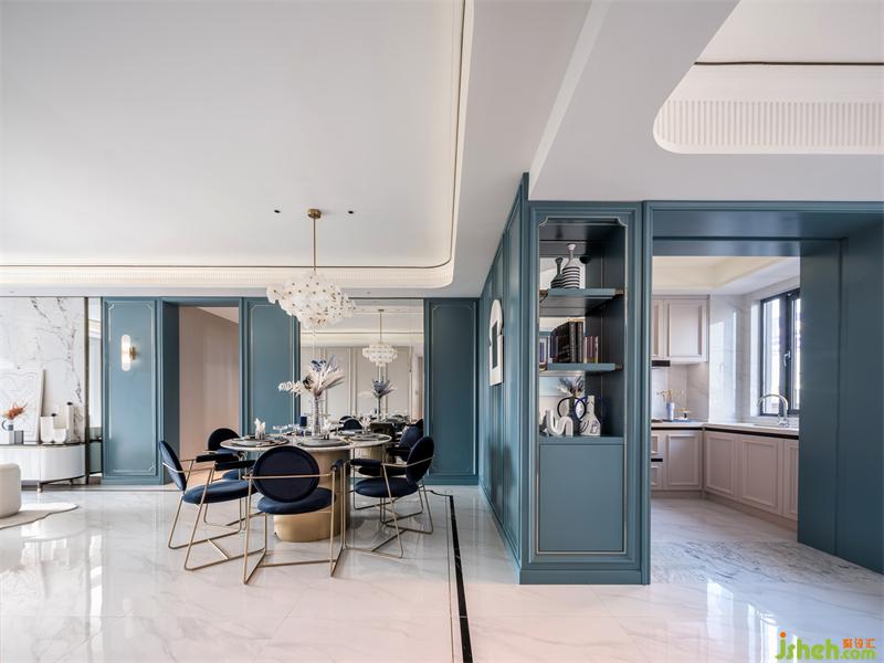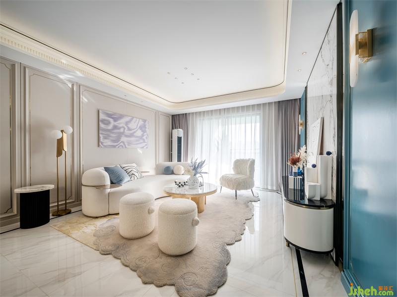 130㎡户型设计以简欧风格设计为主,与时尚元素相结合,整体空间以蓝色作为色彩基调,使用灰、白色中和,浪漫的经典蓝、布艺沙发与挂画、灯具相搭配,样板房设计让空间充满故事性,营造了精致细腻而又自由浪漫的空间格调。