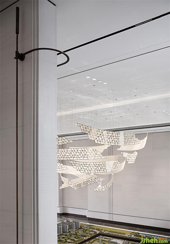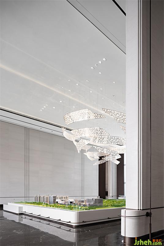 空间顶部的造型,源于这座城市广为人知的文化之光,一赋《岳阳楼记》,比起文采,山水之情景,岳阳楼建筑之别致才是设计团队真正要传承和表达的情怀。站在未来居所的沙盘缩影前,抬头间即可看到时光里的城市痕迹。