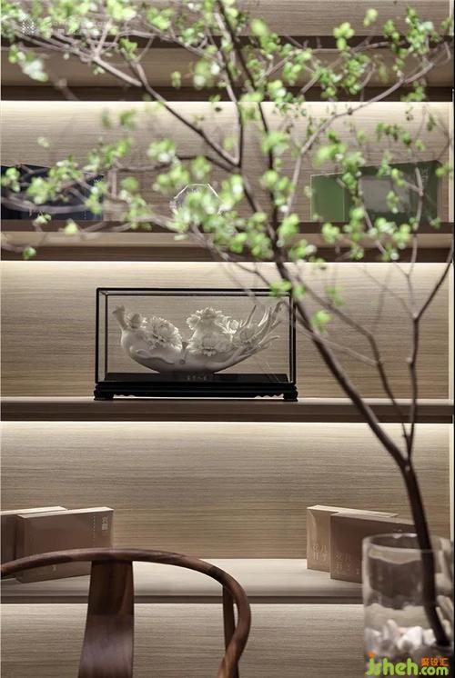 闻一曲悠然,饮一壶好茶。柜体线条简单明了,暗藏于柜内的灯管让古玩藏品脱离平庸,与生机勃勃的树影形成对偶,创造出一副鲜活有趣的意象画卷。