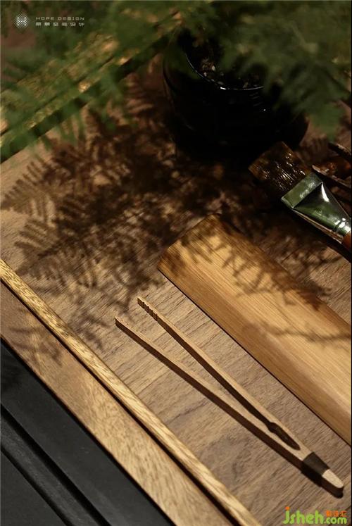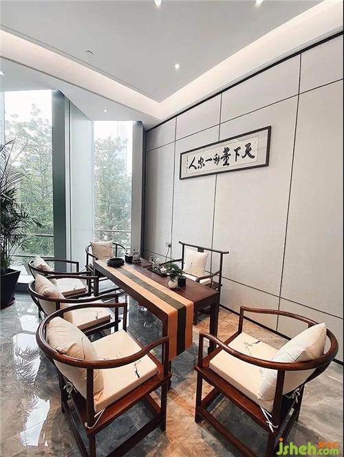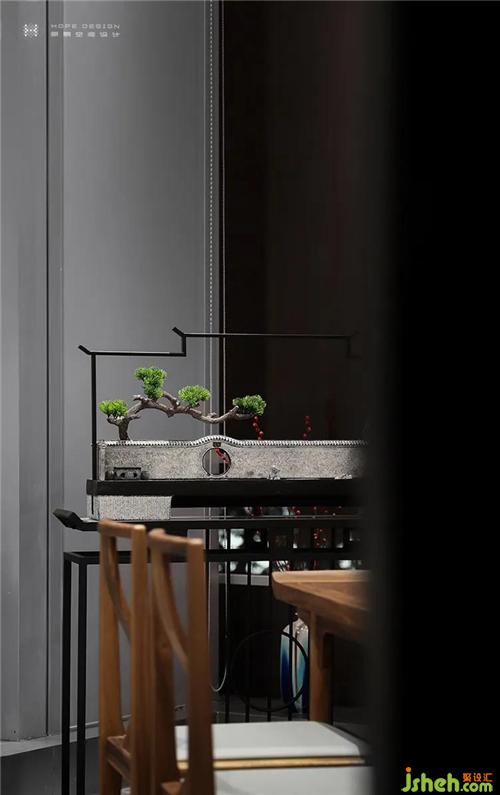 设计师考量视觉美学,为将墙面题字融入氛围,选用水墨花纹的坐垫靠枕进行点缀,让空间更有清逸雅韵。玉碗光含仙掌露,金芽香带玉溪云。邀三五好友,聚于雅室,思大业品茶香,生活本该如此。