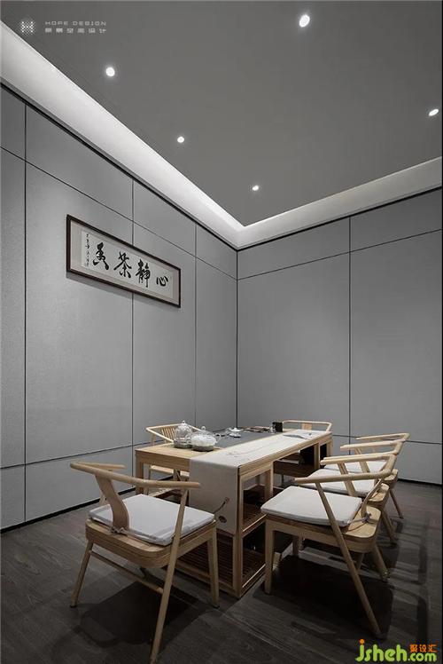 寻茶香入室,素雅质朴的茶室映入眼帘。黑色线条将空间拉伸展开,巧妙的空间配色,婉转表达了空间的气质格调。米色桌布上的水墨画和背景题字相映成趣,艺术的蕴涵与萦绕的茶香交融为一体深圳会所装修设计。