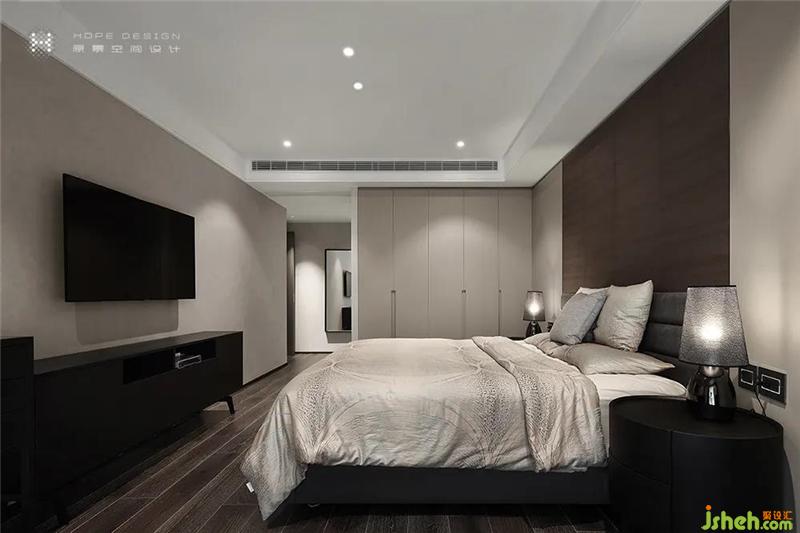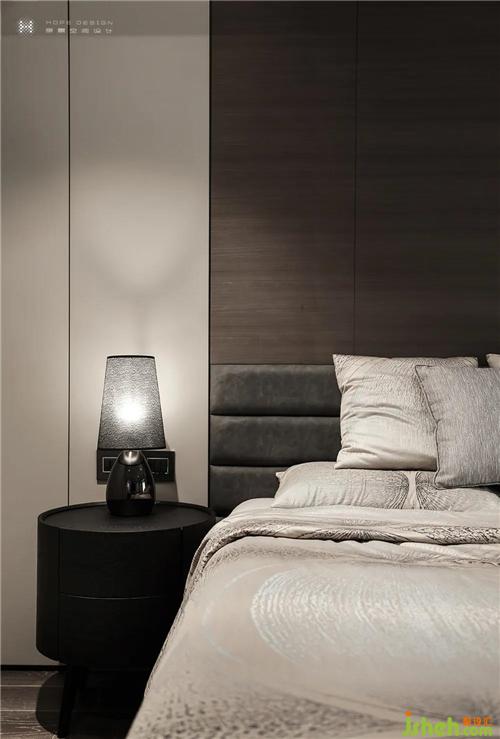 卧室是放松自我的最好安全区,独立私密,回归本我。床头背景采用咖色木质墙板加灰色软包,同色系软包和床头柜糅合,背景墙板与地板色系相通,灯光映衬质感绝佳深圳装修设计。