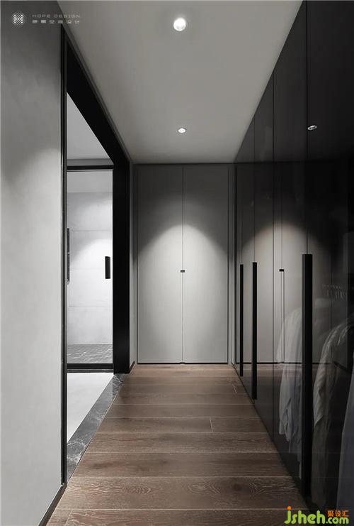 衣帽间采用半开放式设计,玻璃柜门增加了展示性。实为收纳,虚于展示,虚实结合让空间更显宽敞。