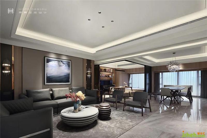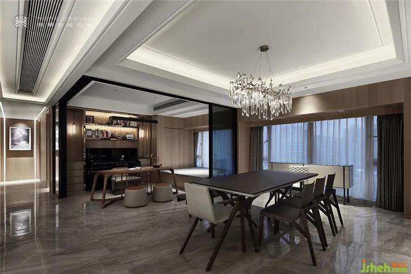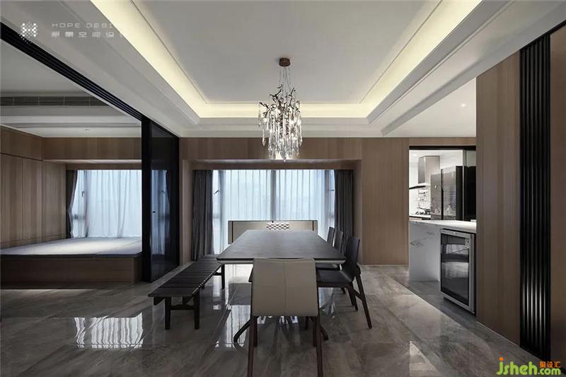 从客餐厅中可以看到设计师对光线、材料选择、空间构成的思考,不仅考虑到自然光线的引入,也考虑到不同类型的灯光设计组合去塑造空间,为空间带来充足光源的同时,也提供了美观造型。配合上不同的材料,光更加是产生出不同的视觉质感,更能把想传递的情感都放到了空间里。