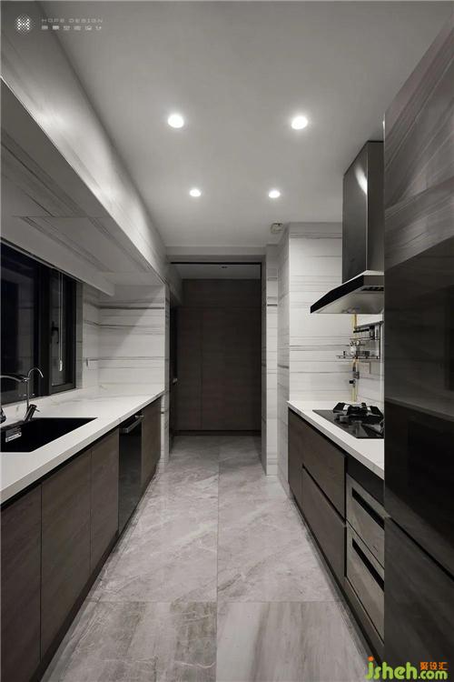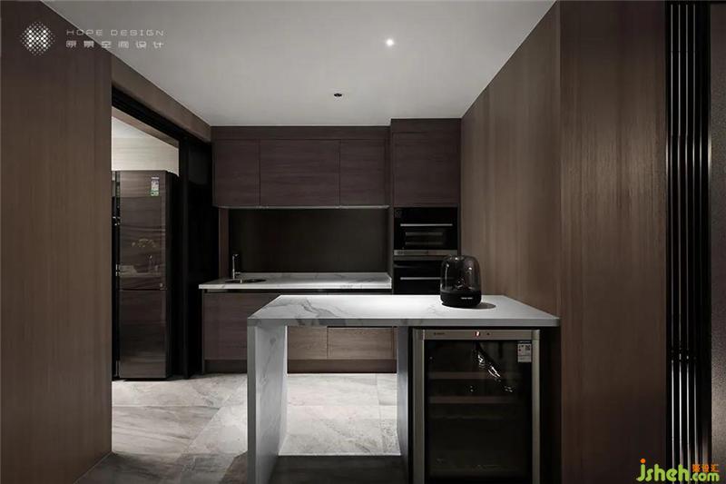 玄关右侧是厨房区域,我们在优化餐厨动线的基础上通过合理切割资源,打造了独立的中西厨区域房。从西厨“借”了一部分空间给玄关,为玄关增加鞋柜与储物柜。深圳装修设计西厨增设岩板吧台,在不同光线的作用下,自然细密的肌理显露出不同层次的色彩,方寸间勾勒出碎碎念与小欢喜,层层铺开温馨的生活碎片。