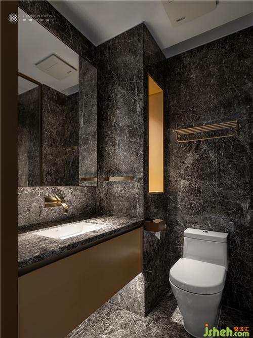 玄关客卫独树一帜的暗色系,灯带暗藏的设计把角落也变得光亮可见更加方便,材质的反光度将空间向镜面延伸,从而让质感由内而外散发。