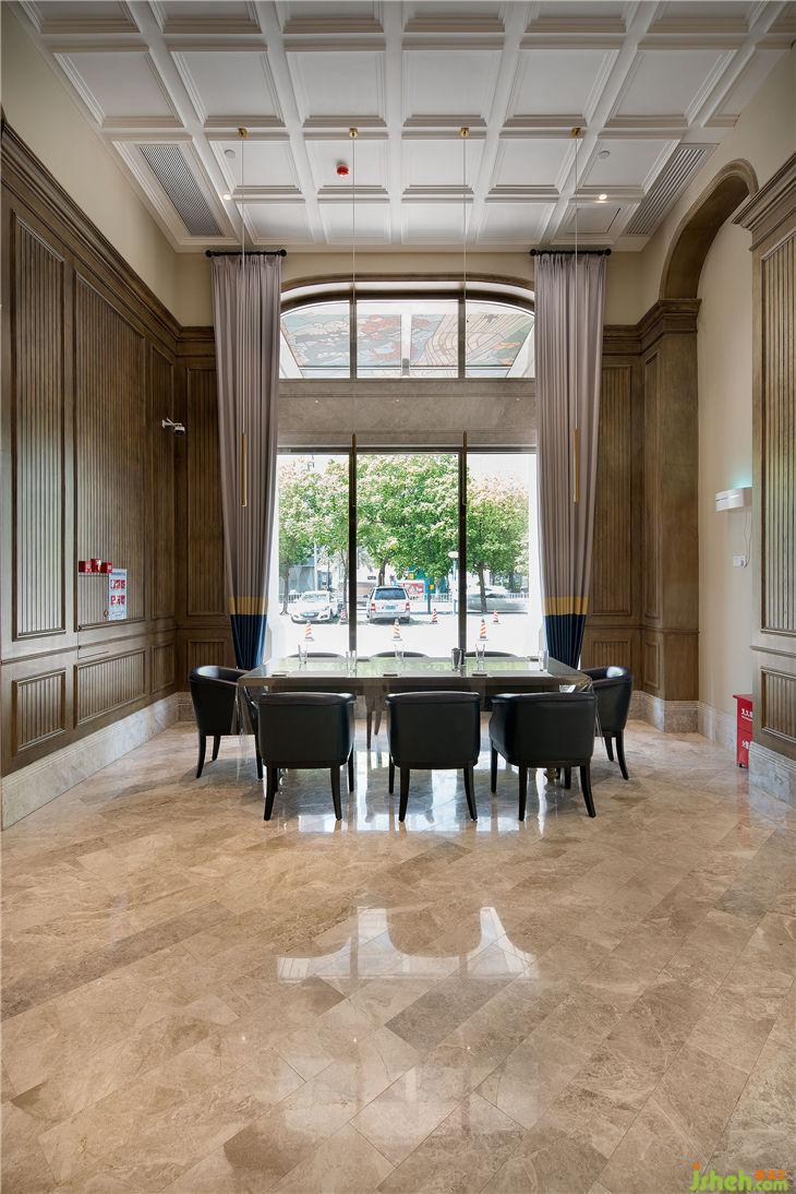 主要材料:灰橡木饰面、古堡灰石材、鱼肚白石材、香槟金色不锈钢、彩色玻璃