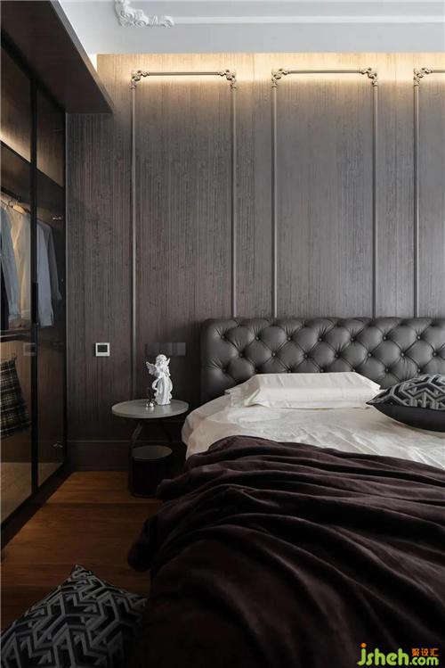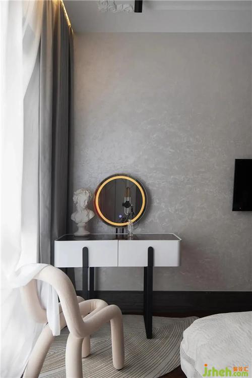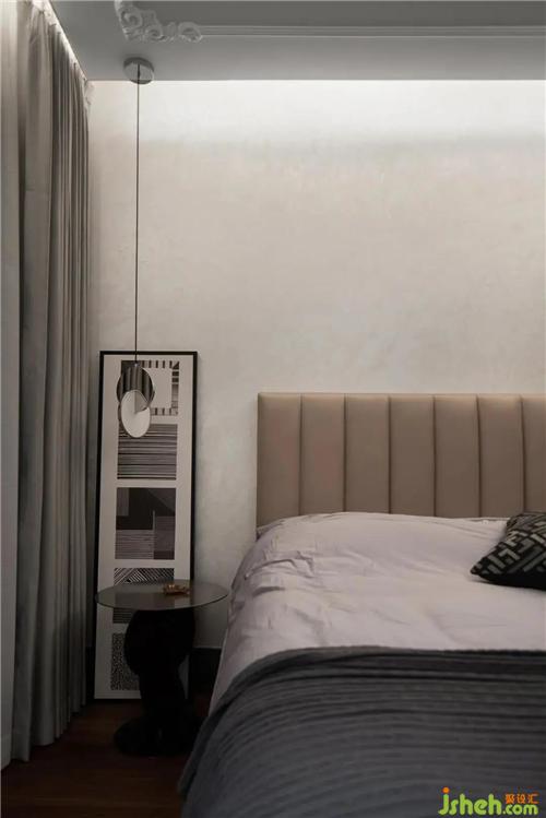 主卧则以低雅不争的灰与木材铸就轻奢的优雅形制,赋予空间丰盈饱满的美学质感。绵延出宁静的诗意。大面积窗户增加了室内光源,窗帘选用了纯白雪纱营造静谧舒适的简单空间。在置入法式家具及配饰元素与现代家具相互结合,令空间充满了时尚气派的高雅感温州装修设计。