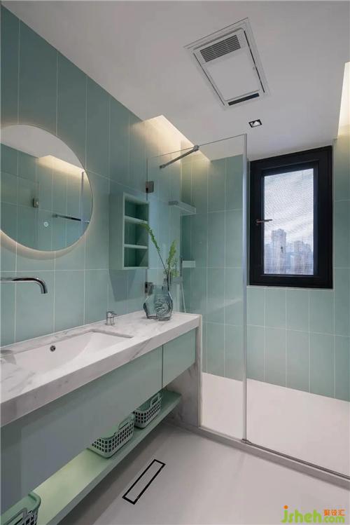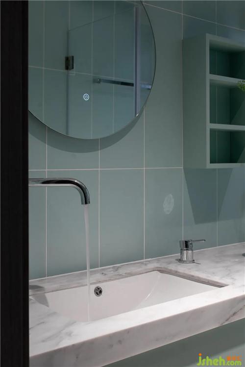 The line of bathroom space is fluent and meticulous, contracted round mirror hangs wall, clear green square ceramic tile joins together each other to present the artistic breath that gives different, bring out the best in each other with lukewarm embellish white marble washs gargle table, let a space become comfortable loosen and advanced feeling is full.