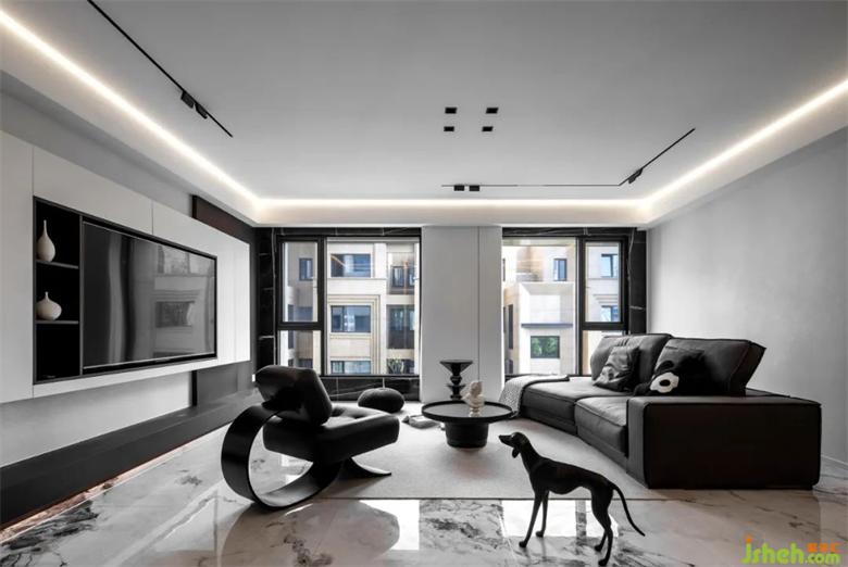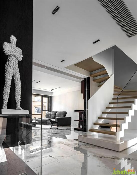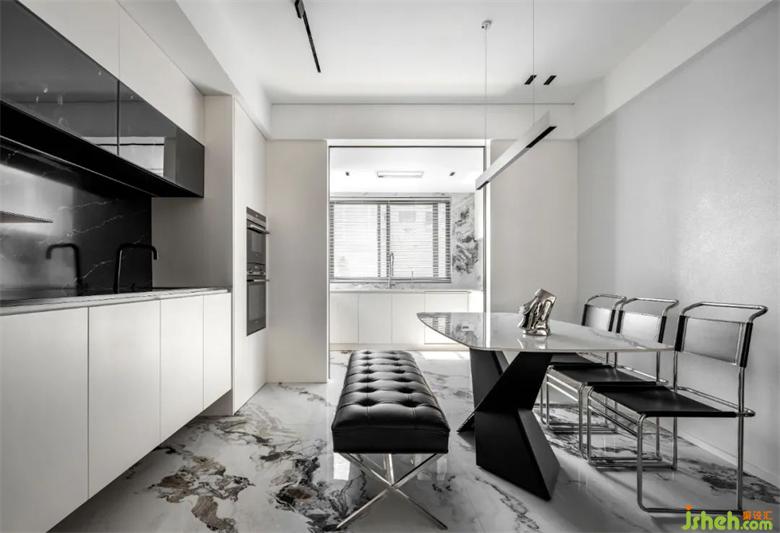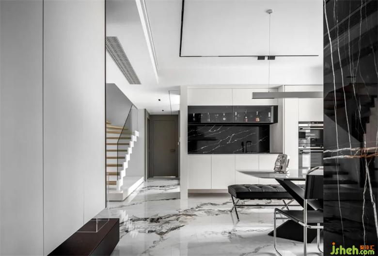 整个空间以典雅的黑白上跃豪宅设计色作为主基调,氛围呈现出一种明亮而舒缓的感觉,简单且十分的随和。从厨房到过道,一直延伸到大厅区域,水墨晕染的白色大理石瓷砖铺叙。极致天然纯净的白色肌底与静谧灰色的延伸纹上跃豪宅设计理搭配,通透而优雅,传递出时尚前卫的艺术品味。