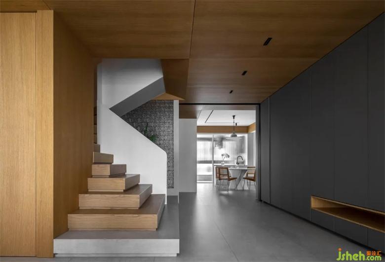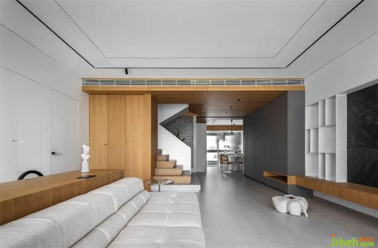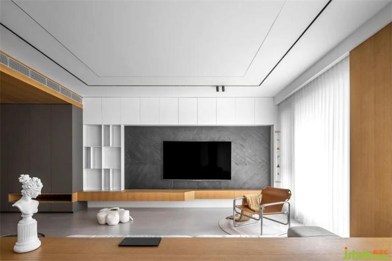 整个客厅空间采用了无主灯设计,两条贯穿客餐厅装修设计的轨道灯就是主要的照明方式。客厅处辅以筒灯点缀,增加局部区域的照明度。吧台的设置,在空装修设计间兼具多种功能。客厅两侧的隐形壁橱设计,也使得储存功能大大增加,在兼具美观的同时包容生活的杂糅。